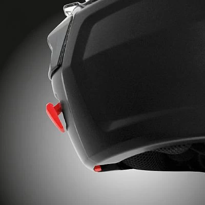 Exklusives Öffnungssystem des DUAL ACTION-Kinnschutzes. In der Mitte des Kinnschutzes positioniert, ermöglicht es ein einfaches Öffnen mit einer Hand. Der Dual-Action-Öffnungsmechanismus reduziert das Risiko eines versehentlichen Öffnens: Der Kinnschutz kann nur durch Betätigen des ersten Entriegelungshebels (oder der Sicherheitssperre) und anschließendes Betätigen des zweiten Hebels geöffnet werden.
